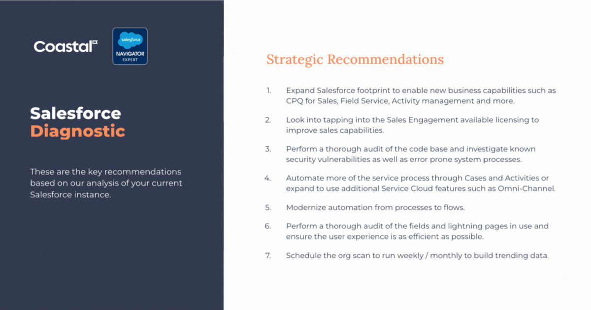 A comprehensive analysis of your Salesforce org performance, identifying issues impacting adoption, efficiency, security, and business performance.
